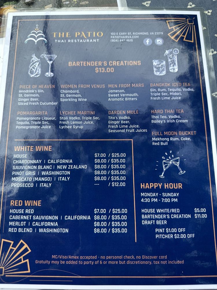 Introducing The Patio Thai, a hidden gem in downtown Richmond offering a cozy and charming dining experience. The menu features a variety of Thai dishes, including flavorful appetizers like Chicken Satay and Roti Green Curry. For soup lovers, options like Tom Yum Soup and Wonton Soup are sure to satisfy. One standout dish is The Patio's Noodle soup, with a rich broth and fresh toppings making it a comforting choice. Customer reviews rave about the warm and inviting atmosphere, friendly staff, and delicious food. The outdoor seating adds to the intimate and romantic vibe of the restaurant, making it a perfect spot for a date night or a special celebration. Overall, The Patio Thai is a must-visit for anyone craving authentic and flavorful Thai cuisine in Richmond.
